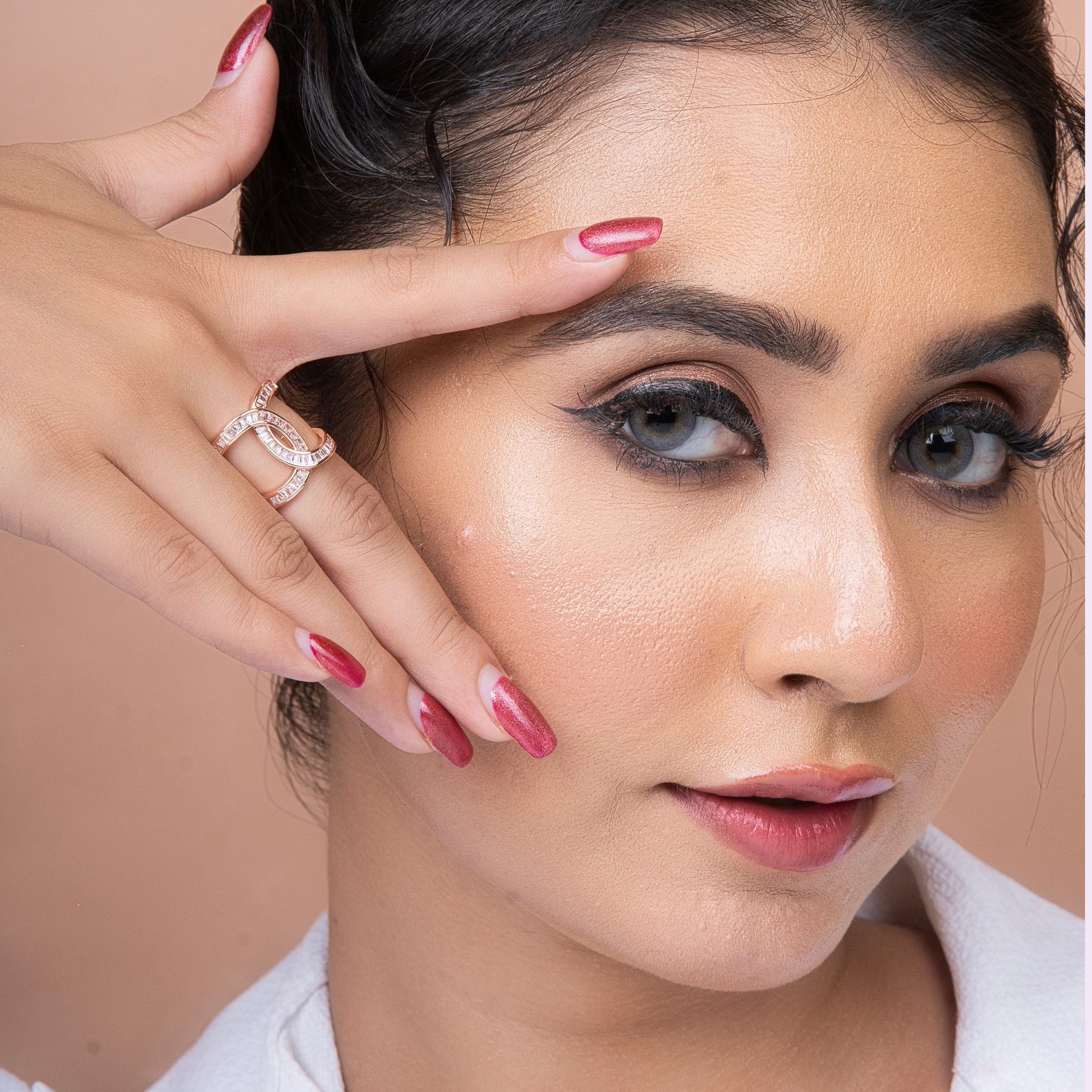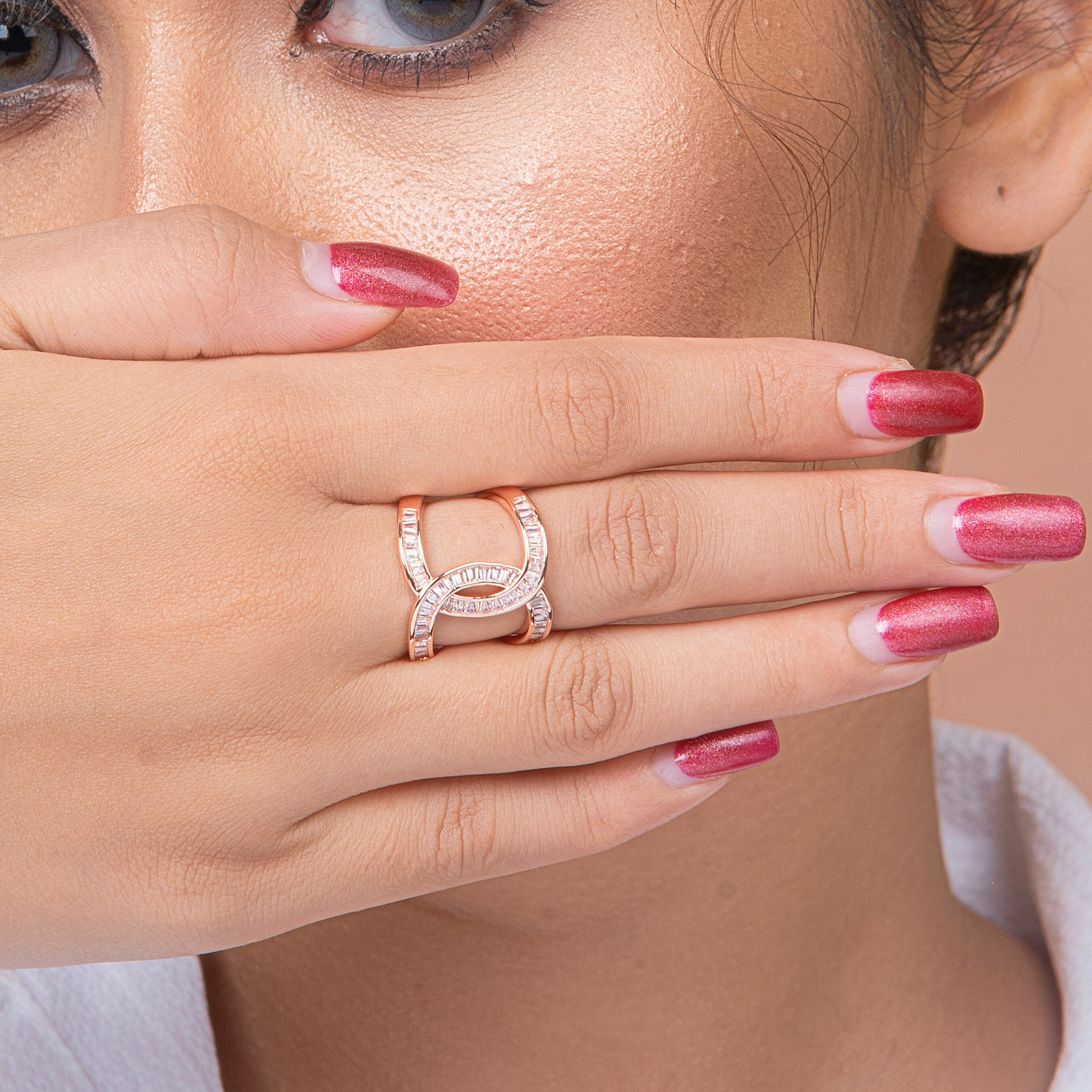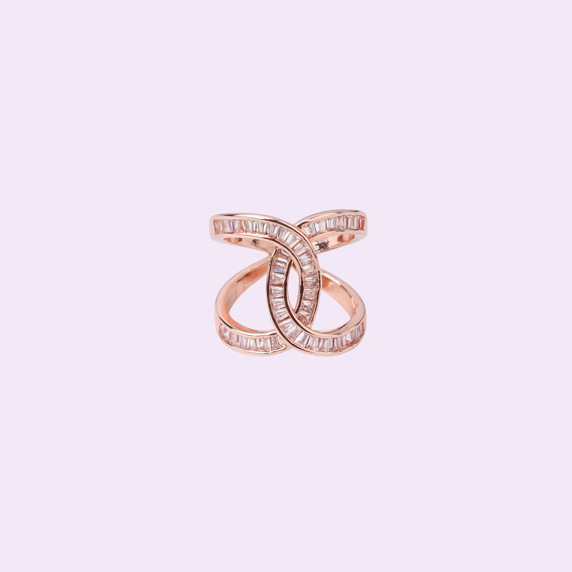 Where timeless elegance meets modern sparkle - the Infinity Glint Ring is designed to delight. This stunning and striking piece features a crossing loop design that resembles the infinity symbol representing eternal love, infinite connection, and everlasting strength. This dazzling ring is filled with finely cut baguette crystals lined along the loops and set in a luxurious rose gold finish, glowing with every turn of your hand.